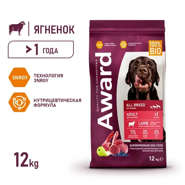 Сухой корм AWARD для взрослых собак всех пород с ягненком с индейкой с добавлением яблока и черники 12 кг.
