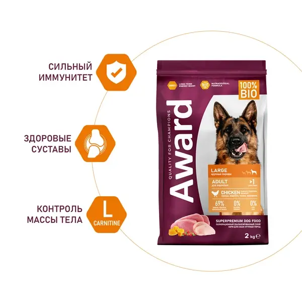 Сухой корм AWARD для взрослых собак крупных пород с курицей и индейкой с добавлением тыквы и шиповника 2кг