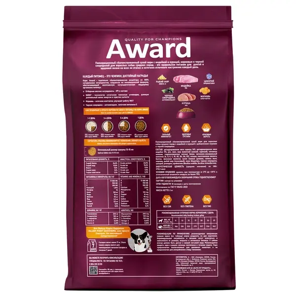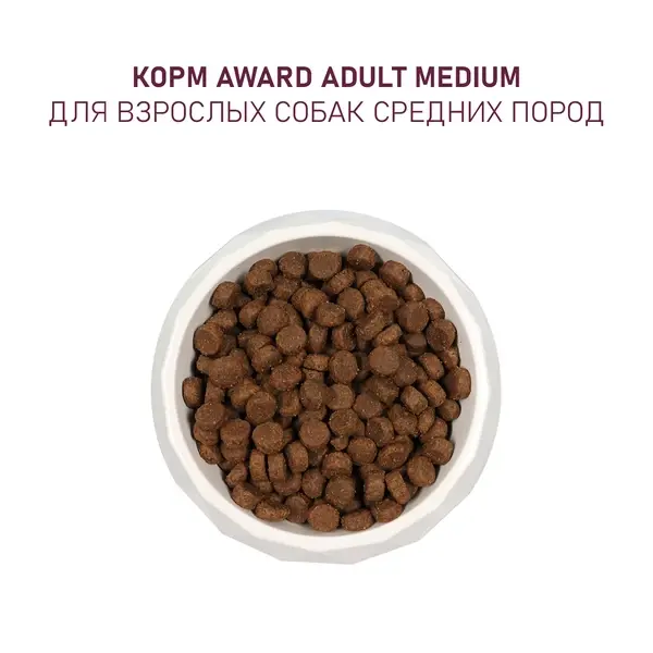 Сухой корм AWARD для взрослых собак средних пород с индейкой и курицей с добавлением моркови и черной смородины 2 кг.