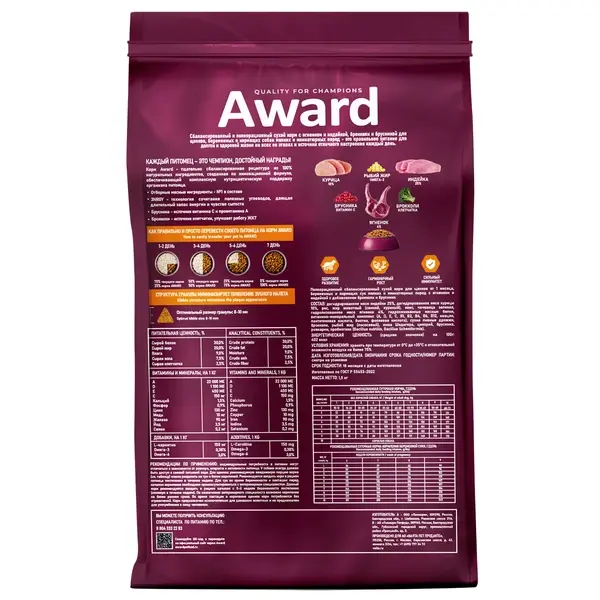 Сухой корм AWARD для щенков от 1 мес, беременных и кормящих сук мелких и мин. пород с ягненком и индейкой с добавлением брокколи и брусники 800 г.