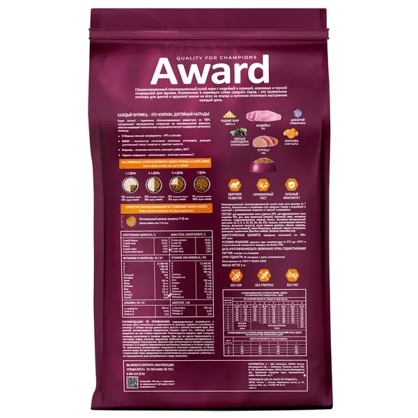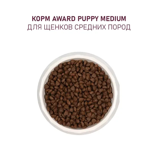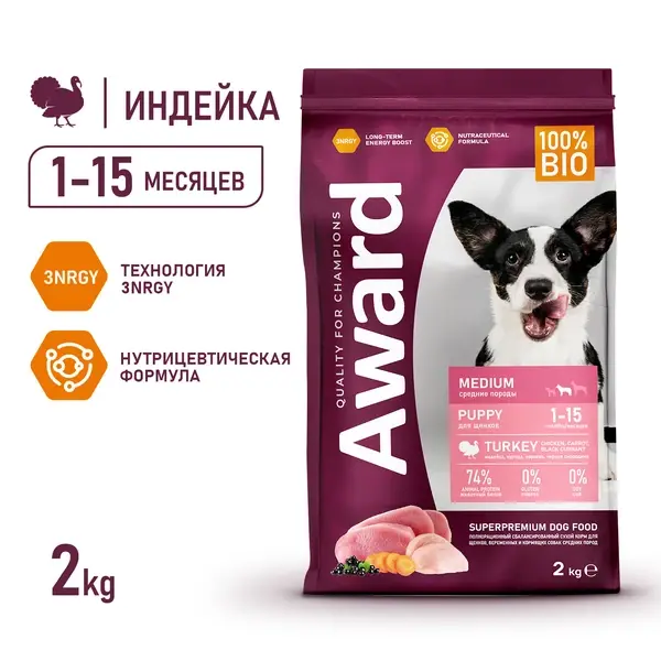 Сухой корм AWARD для щенков от 1 мес, беременных и кормящих сук средних пород с индейкой и курицей с добавлением моркови и черной смородины 2 кг.