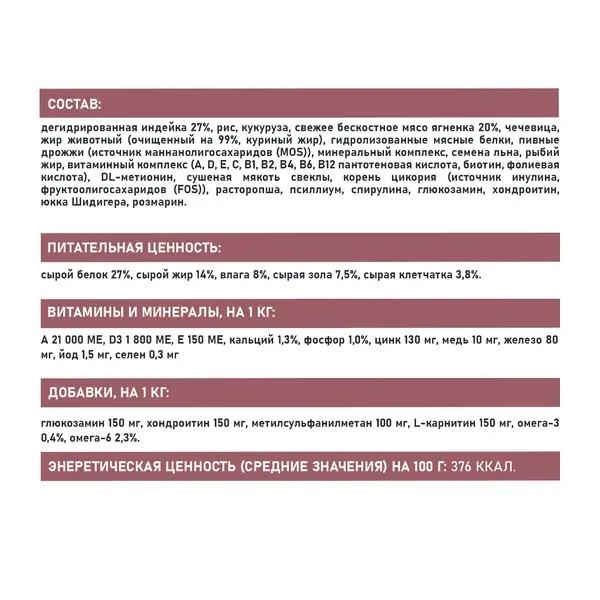 СОСТАВ: дегидрированная индейка 27%, рис, кукуруза, свежее бескостное мясо ягненка 20%, чечевица, жир животный (очищенный на 99%, куриный жир), гидролизованные мясные белки, пивные дрожжи (источник маннанолигосахаридов (MOS)), минеральный комплекс, семена льна, рыбий жир, витаминный комплекс (A, D, E, C, B1, B2, B4, B6, B12 пантотеновая кислота, биотин, фолиевая кислота), DL-метионин, сушеная мякоть свеклы, корень цикория (источник инулина, фруктоолигосахаридов (FOS)), расторопша, псиллиум, спирулина, глюкозамин, хондроитин, юкка Шидигера, розмарин.
