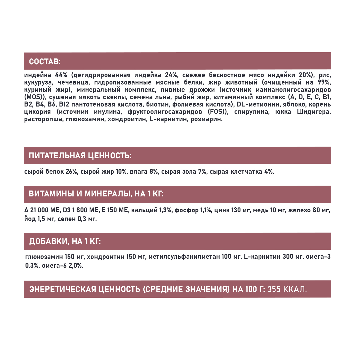 СОСТАВ: индейка 44% (дегидрированная индейка 24%, свежее бескостное мясо индейки 20%), рис, кукуруза, чечевица, гидролизованные мясные белки, жир животный (очищенный на 99%, куриный жир), минеральный комплекс, пивные дрожжи (источник маннанолигосахаридов (MOS)), сушеная мякоть свеклы, семена льна, рыбий жир, витаминный комплекс (A, D, E, C, B1, B2, B4, B6, B12 пантотеновая кислота, биотин, фолиевая кислота), DL-метионин, яблоко, корень цикория (источник инулина, фруктоолигосахаридов (FOS)), спирулина, юкка Шидигера, расторопша, глюкозамин, хондроитин, L-карнитин, розмарин.