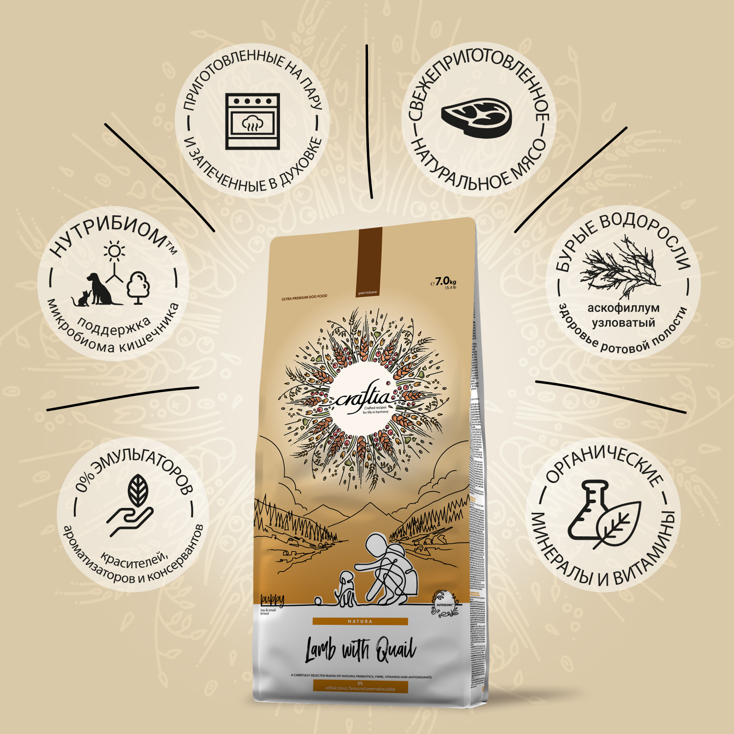 CRAFTIA NATURA — ультрапремиум сухой корм для щенков миниатюрных и мелких пород с ягненком и перепелкой, созданный с уважением к природе и заботой о здоровье питомца.