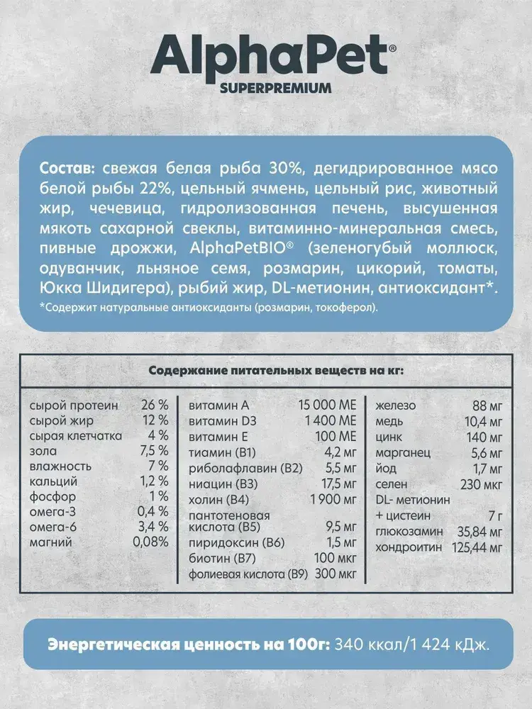 Monoprotein из белой рыбы AlphaPet Superpremium — полнорационный сухой корм, созданный специально для взрослых собак мелких пород. Свежая белая рыба (30%) на первом месте в составе обеспечивает чистый, легко усвояемый белок и деликатный рыбный вкус, который высоко ценят привередливые