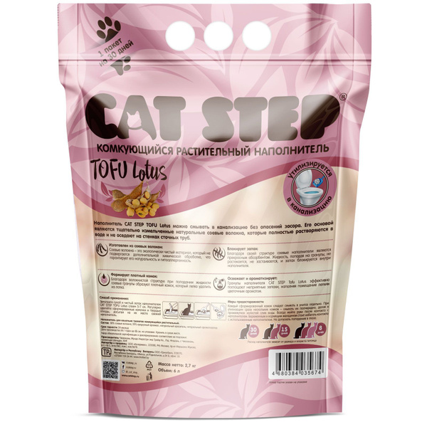 CAT STEP Tofu Lotus — экологичный растительный наполнитель для кошек на основе водорастворимых растительных волокон. Материал моментально впитывает влагу и образует плотные комки, которые легко удаляются без остатков — жидкость не растекается, а неприятные запахи надёжно удерживаются внутри комка. Наполнитель не подвергается химической обработке, поэтому он гипоаллергенен и безопасен для животных с чувствительной кожей и для их владельцев.