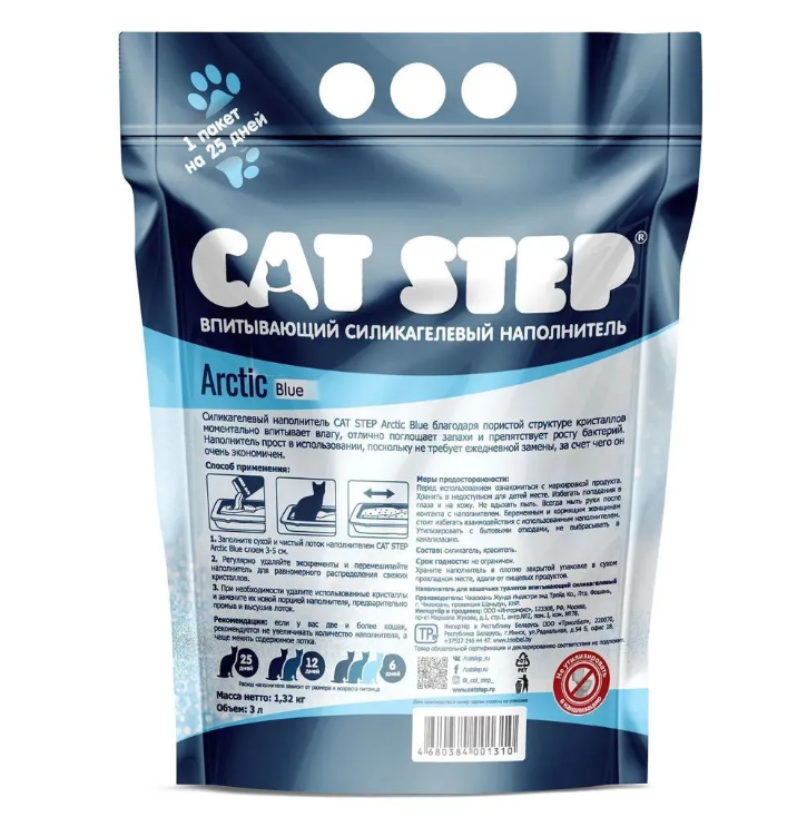 Силикагелевый наполнитель для кошек CAT STEP Arctic Blue — компактный и эффективный вариант для поддержания чистоты лотка. Яркие синие гранулы с пористой структурой быстро впитывают влагу и надежно удерживают запахи внутри кристаллов, обеспечивая свежесть в помещении. Благодаря неорганическому составу продукт препятствует развитию бактерий и грибков, что делает его более гигиеничным по сравнению с органическими наполнителями.