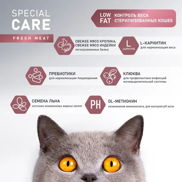 - Сбалансированный состав, высокое содержание мясных ингредиентов необходимых для сохранения мышечной массы и энергии питомца. L-карнитин позволяет контролировать массу тела.