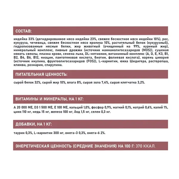 СОСТАВ: индейка 33% (дегидрированное мясо индейки 23%, свежее бескостное мясо индейки 10%), рис, кукуруза, чечевица, свежее бескостное мясо кролика 10%, растительный белок (кукурузный), гидролизованные мясные белки, жир животный (очищенный на 99%, куриный жир), минеральный комплекс, пивные дрожжи (источник маннанолигосахаридов (MOS)), сушеная мякоть свеклы, плазма крови, семена льна, DL-метионин, витаминный комплекс (А, D, E, К3, В1, В2, В4, В6, В12, ниацин, пантотеновая кислота, биотин, фолиевая кислота), L-карнитин, корень цикория (источник инулина, фруктоолигосахаридов (FOS)), юкка Шидигера, расторопша, клюква, розмарин, спирулина.
