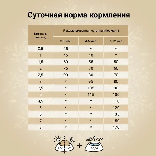 Питательные добавки на 1 кг: витамин А – 20000ME; витамин D3 – 2000ME; витамин Е – 240 мг; витамин С – 200 мг; ниацинамид - 60 мг; D-пантенол - 25 мг; витамин B2 - 12,5 мг; витамин B6 - 7,5 мг; витамин B1 - 12,5 мг; биотин - 0,6 мг; фолиевая кислота - 0,6 мг; витамин B12 - 0,1 мг; холина хлорид - 2800 мг; Цинк (Хелат цинка гидрата глицина) - 94 мг; Марганец (Хелат марганца гидрата глицина) - 20 мг; Железо [Хелат железа (II) гидрата глицина] - 72 мг; Медь [Хелат меди (II) гидрата глицина] - 14 мг; Йод (безводный йодат кальция) - 2 мг; Cелен (L–селенометионин) - 0,32 мг; DL-метионин, технически чистый - 3000 мг; Tаурин 1980 мг. Антиоксиданты: экстракт токоферолов из растительных масел.