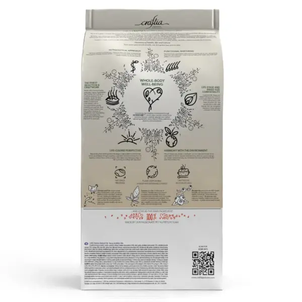 Состав кормов CRAFTIA прозрачен и понятен, отсутствуют скрытые добавки и сомнительные ингредиенты. Все, что заявлено в составе корма, гарантированно присутствует в каждой грануле. Собственный завод, сотни квадратных метров научно-исследовательских лабораторий, первоклассное сырье — все это позволяет создавать тщательно сбалансированный высокобелковый корм с холистическим подходом. Все компоненты корма подходят для употребления человеком и не содержат ГМО.