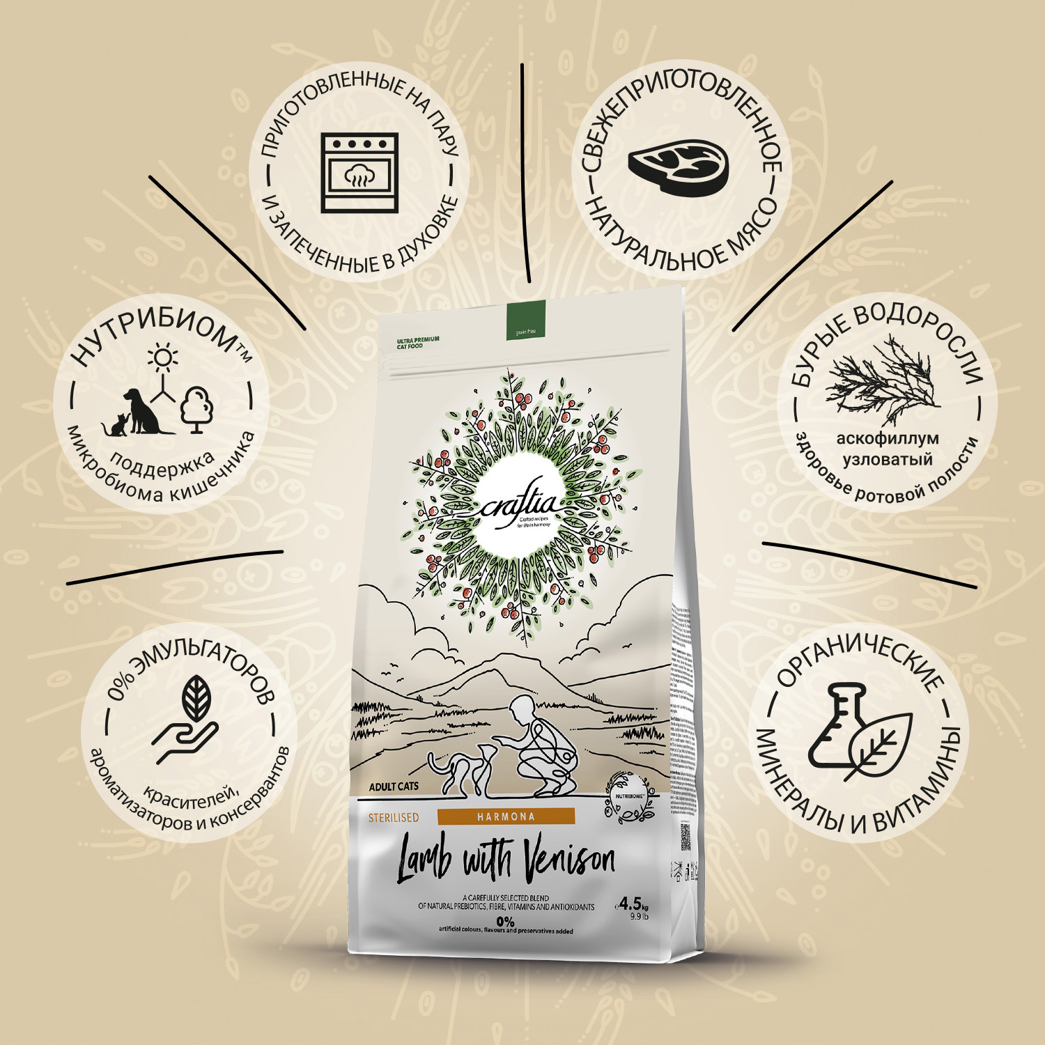 CRAFTIA HARMONA — ультрапремиум сухой корм для стерилизованных кошек с ягнёнком и олениной, созданный с уважением к природе и заботой о здоровье питомца. Рецептура полностью прозрачна: в составе нет скрытых добавок, ГМО и химической обработки сырья — каждый ингредиент соответствует заявленным показателям и входит в каждую гранулу.
