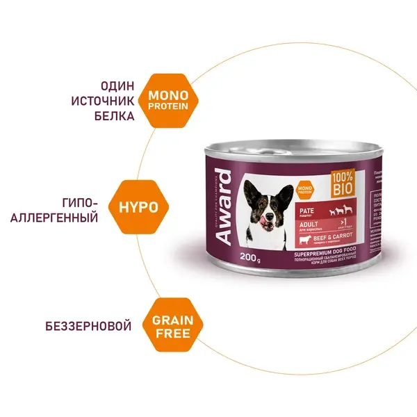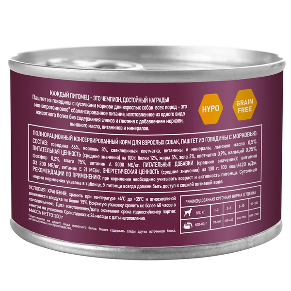 Паштет из говядины с кусочками моркови для взрослых собак - это монопротеиновое сбалансированное питание для любимого питомца, изготовленое из одного вида мясного белка без содержания зерна и глютена, с добавлением овощей и фруктов богатых витаминами и минералами.