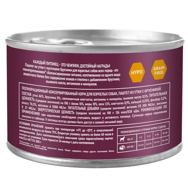 Паштет из утки с кусочками брусники для взрослых собак - это монопротеиновое сбалансированное питание для любимого питомца, изготовленое из одного вида мясного белка без содержания зерна и глютена, с добавлением овощей и фруктов богатых витаминами и минералами.