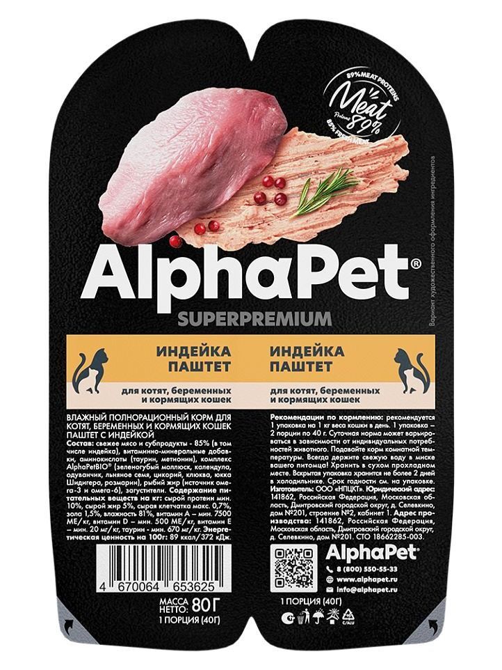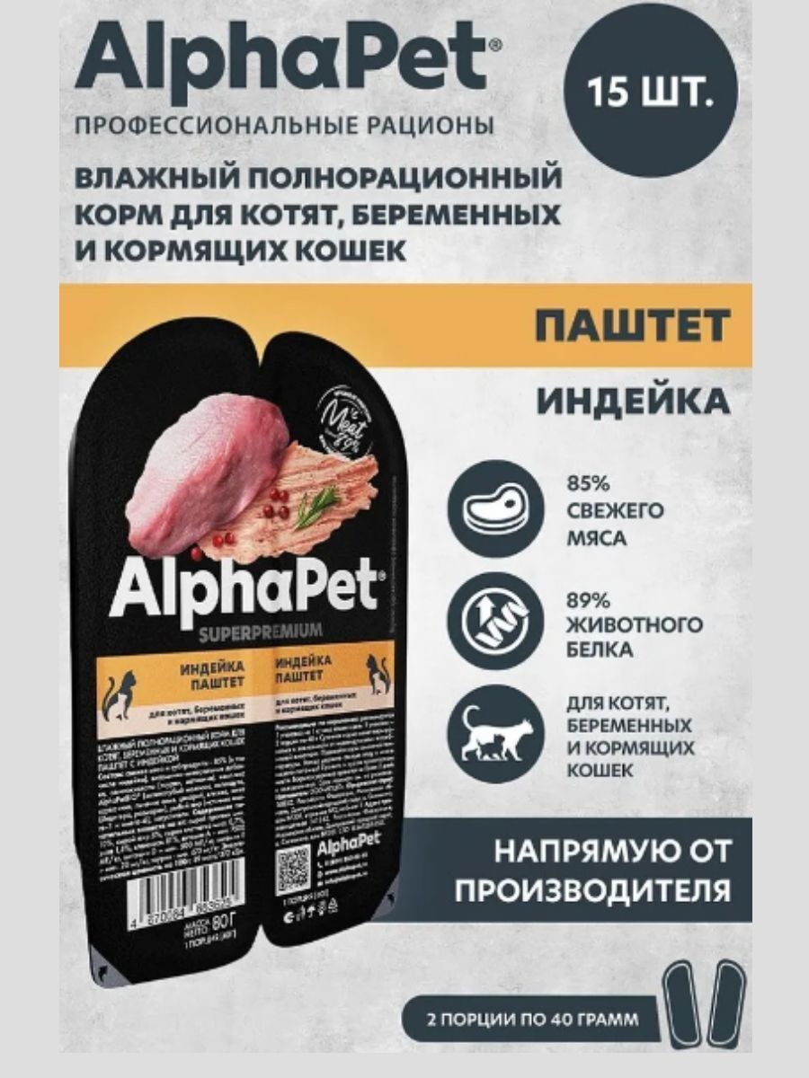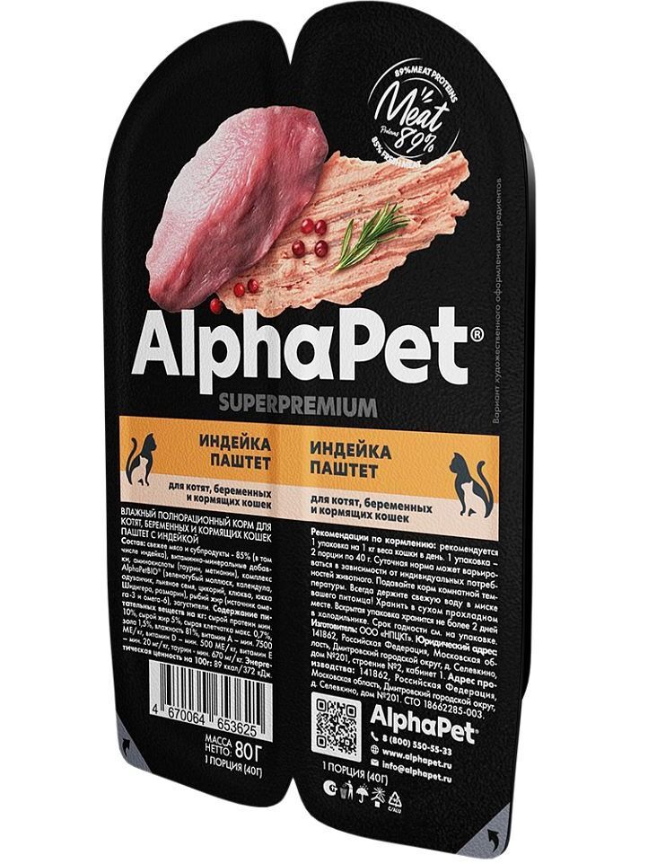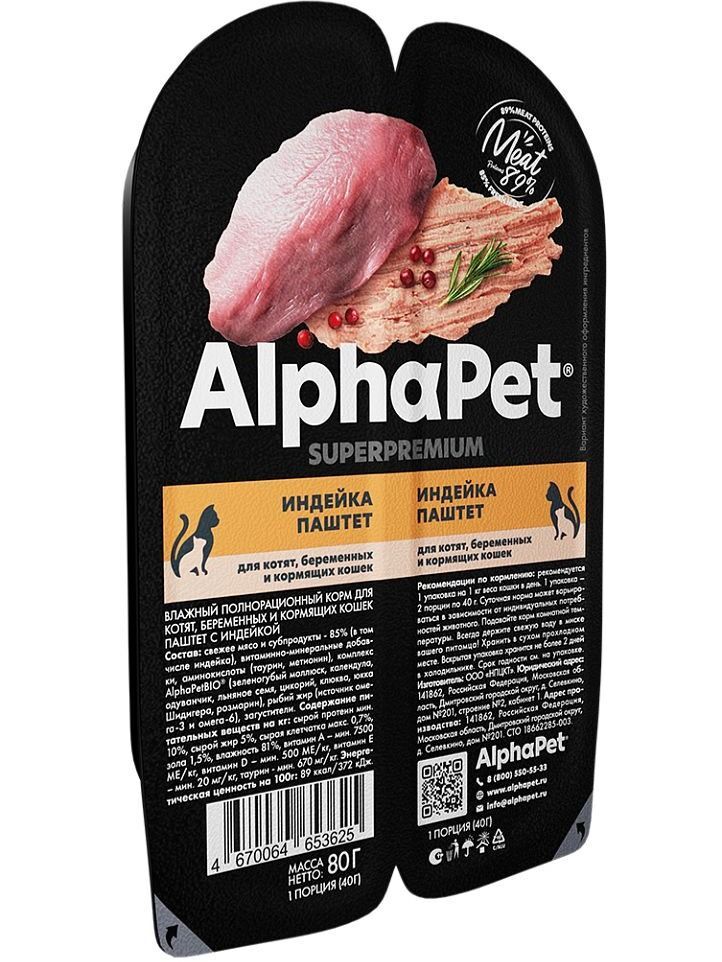 AlphaPet Superpremium - это высококачественный влажный корм для беременных и кормящих кошек, корм для котят влажный, который идеально подходит для беременных, кормящих кошек и котят. Этот паштет с индейкой содержит 89% мясного протеина и 85% свежего мяса, что делает его идеальным источником питательных веществ для вашего питомца. Особенности AlphaPet Superpremium включают в себя беззерновую рецептуру, высшую категорию качества Holistic, натуральные ингредиенты и отсутствие ГМО, искусственных красителей и ароматизаторов. Бережная технология производства сохраняет вкусовые и питательные свойства свежего мяса, а уникальный комплекс натуральных добавок AlphaPetBIO обогащает корм необходимыми витаминами и минералами. Состав корма для котят влажный в виде паштета включает свежее мясо и субпродукты (в том числе индейку), витаминно-минеральные добавки, комплекс AlphaPetBIO (состоящий из зеленогубого моллюска, календулы, одуванчика, льняного семени, цикория, клюквы, Юкки Шидигеры и розмарина), рыбий жир (источник омега-3 и омега-6) и загустители. Энергетическая ценность AlphaPet Superpremium на 100 грамм составляет 89 ккал/372 кДж, что обеспечивает вашего питомца всем необходимым для здорового роста и развития. Покормите свою кошку лучшим - покормите ее AlphaPet Superpremium!