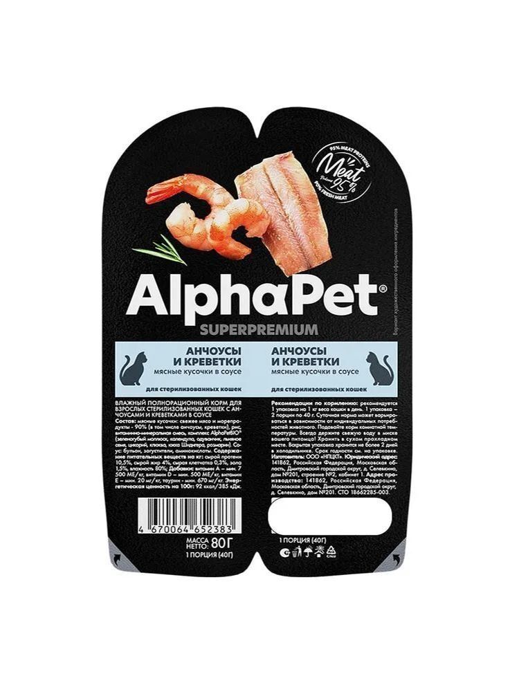 Состав влажного корма для кошек стерилизованных включает в себя свежее мясо и морепродукты, рис, витаминно-минеральную смесь и комплекс AlphaPetBio. Мясные кусочки содержат 90% мяса, включая анчоусы и креветки, которые обогащают корм важными питательными веществами. Соус на основе бульона и аминокислот добавляет вкус и аромат корму. Гарантированные показатели нашего корма: сырой протеин - 10,5%, сырой жир - 4%, сырая клетчатка - 0,3%, зола - 1,5%, влажность - 80%. Дополнительно к корму добавлены витамины A, D, E и таурин, чтобы обеспечить вашего питомца всем необходимым. Выбирайте AlphaPet Superpremium - лучшее питание для вашего питомца, которое обеспечит ему здоровье, активность и счастье!