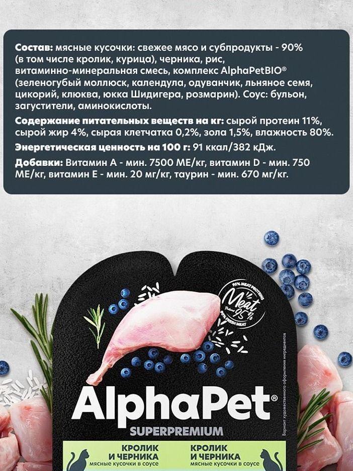 Дополнительно в составе влажный корм для кошек присутствует черника, рис и витаминно-минеральная смесь, а также комплекс AlphaPet®BIO, который включает в себя полезные компоненты, такие как зеленогубый моллюск, календула, одуванчик, льняное семя, цикорий, клюква, Юкка Шидигера и розмарин. Соус, в котором плавают кусочки мяса, приготовлен на основе бульона с добавлением загустителей и аминокислот для улучшения вкуса и питательности продукта.