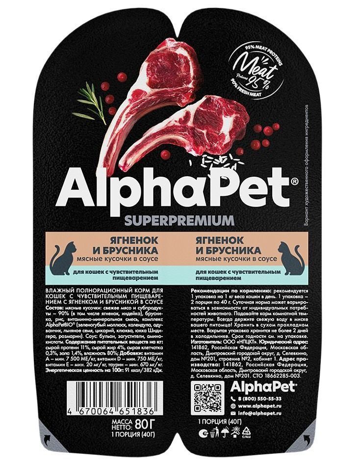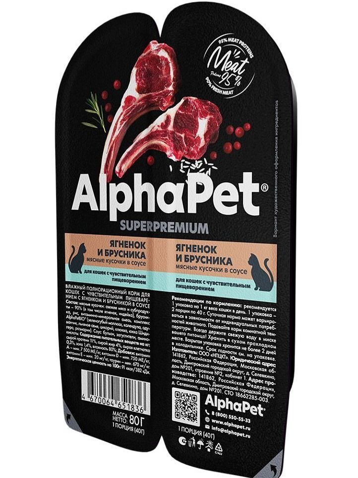 Корм для кошек влажный АльфаПет Суперпремиум представляет: 0,08 кг нежнейших мясных кусочков из ягненка и брусники в соусе, специально разработанных для кошек с чувствительным пищеварением (651836). Наш влажный корм для кошек рекомендован для кошек, которые нуждаются в особом уходе и внимании к своему пищеварительному здоровью. Мясные кусочки составлены из свежего мяса и субпродуктов, насыщенных белком и питательными веществами. В состав входят ягненок и индейка, обеспечивая вашего питомца всем необходимым для здорового и сбалансированного питания. Кроме того, мы добавили бруснику, богатую антиоксидантами, рис, обогащенный углеводами, и витаминно-минеральную смесь, чтобы ваша кошка получала все необходимые питательные вещества. Наш комплекс AlphaPet®BIO включает в себя зеленогубый моллюск, календулу, одуванчик, льняное семя, цикорий, клюкву, Юкка Шидигера и розмарин - все это для поддержания здоровья и благополучия вашего питомца. Соус, в котором купаются наши кусочки, приготовлен на основе бульона с добавлением загустителей и аминокислот, чтобы обеспечить неповторимый вкус и аромат.