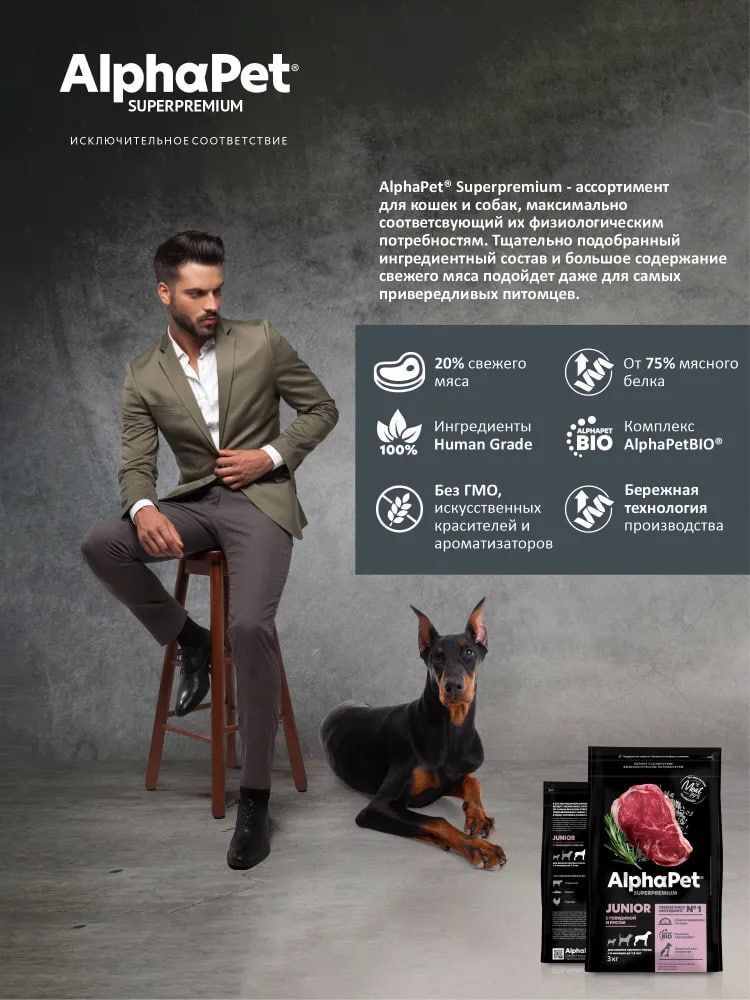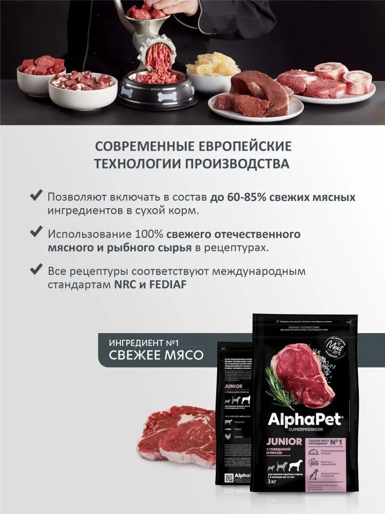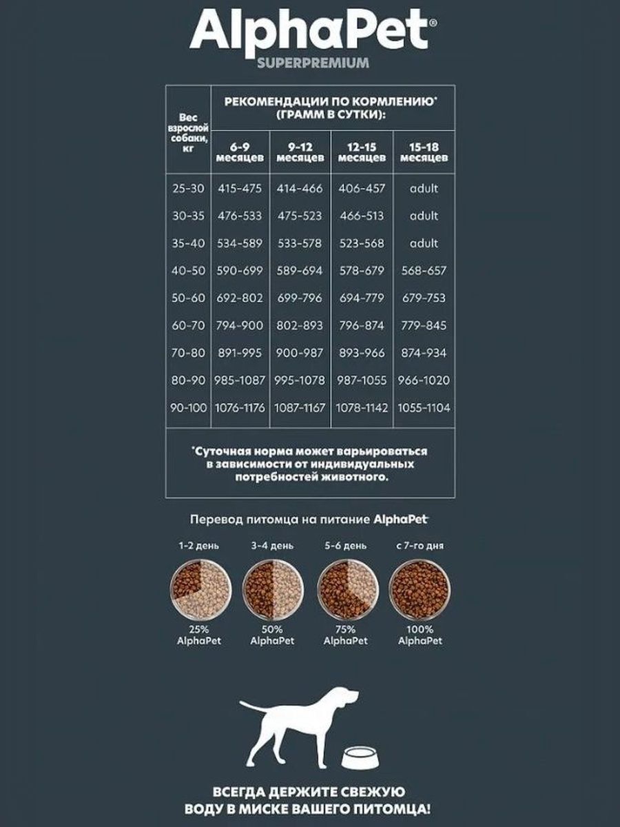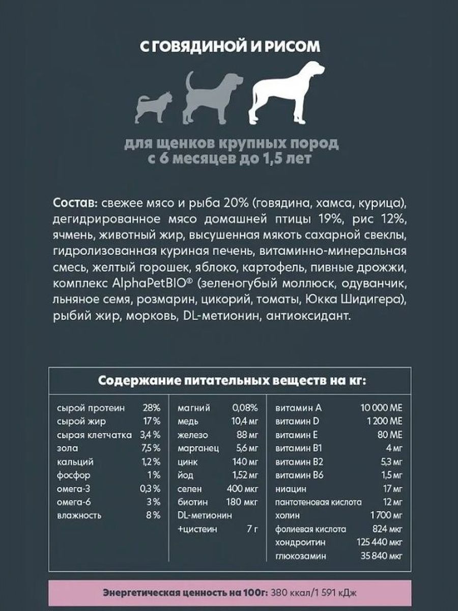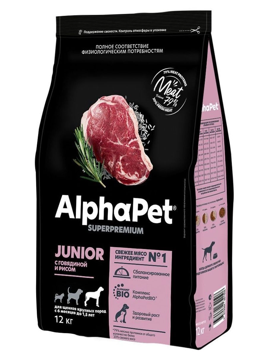Полнорационный корм для собак сухой, корм для юниоров крупных пород на основе свежей натуральной говядины с добавлением риса. Сухой корм для собак содержит в составе 86% натурального мясного белка с мощным аминокислотным профилем. Собачий корм, а также комплекс трав и экстрактов AlphapetBIO помогают укрепить иммунную систему щенков, что снижает риск заболеваний.Зоотовары для собак АльфаПет Суперпремиум обеспечивают оптимальный баланс фосфора, кальция и витамина Д для укрепления опорно-двигательного аппарата. Корм для собак сухой для крупных пород снижает риск получить травму. Высокий уровень белка корма для собак крупных пород АльфаПет Суперпремиум помогает нормальному развитию мышечного аппарата.Премиум корма AlphaPet Superpremium обеспечивают высокий уровень физической активности щенков. Корма для собак премиум класса позволяют активно расти и развиваться.