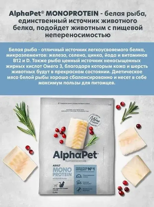 Сухой полнорационный корм MONOPROTEIN из белой рыбы для взрослых кошек AlphaPet Superpremium