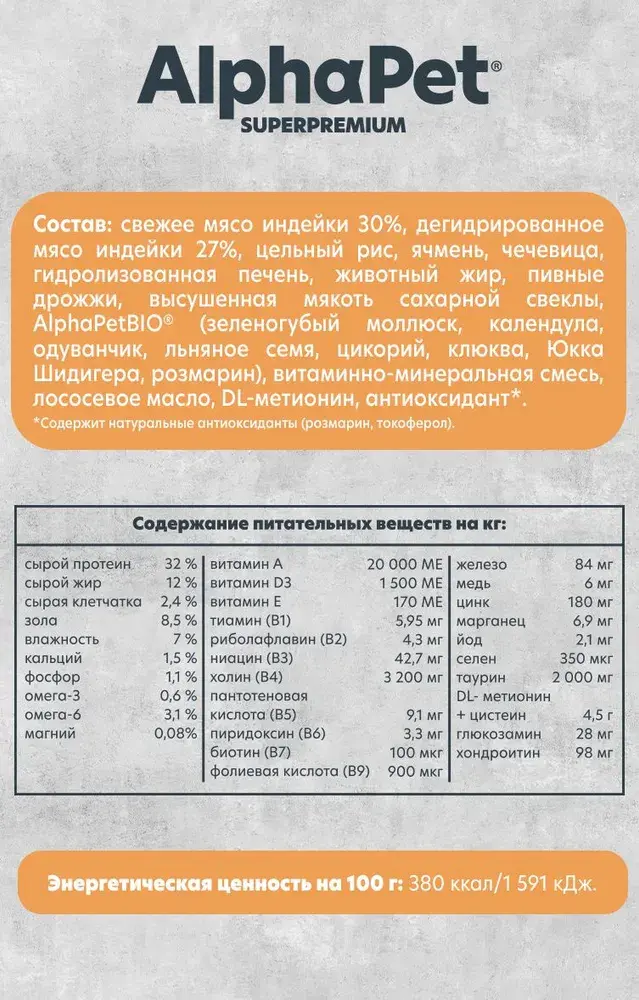 Ингредиенты: свежее мясо индейки 30%, дегидрированное мясо индейки 27%, цельный рис, цельный ячмень, чечевица, гидролизованная печень, животный жир, пивные дрожжи, высушенная мякоть сахарной свеклы, AlphaPetBIO (зеленогубый моллюск, календула, одуванчик, льняное семя, цикорий, клюква, Юкка Шидигера, розмарин), витаминно-минеральная смесь, лососевое масло, DL-метионин, антиоксидант*. *Содержит натуральные антиоксиданты (розмарин, токоферол).