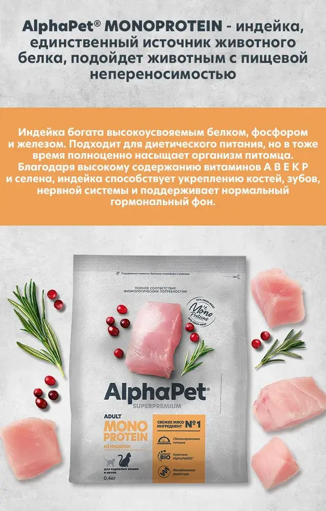 AlphaPet Monoprotein - благодаря единственному источнику животного белка, подойдет животным с пищевой непереносимостью. Индейка богата высокоусвояемым белком, фосфором и железом. Подходит для диетического питания, но в тоже время полноценно насыщает организм питомца. Благодаря высокому содержанию витаминов А В Е К Р и селена, индейка впособствует укреплению костей, зубов, нервной системы и поддерживает нормальный гормональный фон.