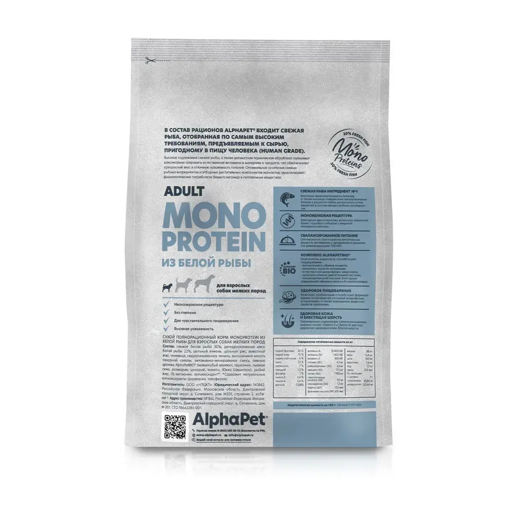 Сухой полнорационный корм MONOPROTEIN из белой рыбы для взрослых собак мелких пород AlphaPet Superpremium