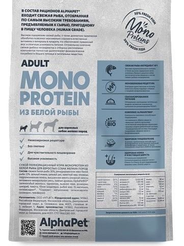 Представляем вам новый продукт от AlphaPet - сухой корм для крупных собак AlphaPet Superpremium Monoprotein из белой рыбы! Этот корм премиум класса специально разработан для взрослых собак средних и крупных пород.Основным преимуществом этого корма является монобелковая рецептура, что делает его идеальным выбором для животных с пищевой непереносимостью. Свежая рыба является основным ингредиентом в составе, обеспечивая большой процент мясного белка.Уникальный комплекс натуральных добавок AlphaPetBIO® делает этот корм еще более полезным для вашего питомца. Ингредиенты, используемые в корме, соответствуют уровню Human Grade, что гарантирует высокое качество продукта.Низкозерновая рецептура обеспечивает легкое усвоение корма, а высокая поедаемость и вкусовая привлекательность делают его незаменимым для вашего питомца.Не ждите, попробуйте сухой корм AlphaPet Superpremium Monoprotein уже сегодня и убедитесь в его превосходном качестве!