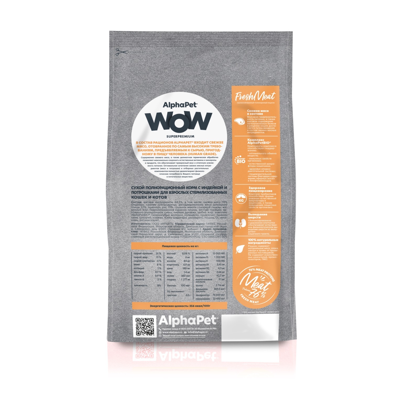Сухой полнорационный корм с индейкой и потрошками для взрослых стерилизованных кошек и котов AlphaPet WOW® Superpremium