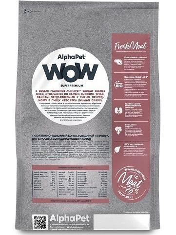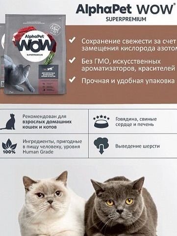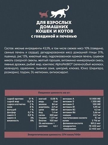 Корм для кошек сухой с говядиной и печенью для питомцев от года AlphaPet WOW Superpremium. Кошачий корм альфапет соответствует физиологическим потребностям взрослых кошек и котов. Сухой корм для кошек содержит 76% мясного белка. Корм Альфа Пет WOW Суперпремиум быстро утоляет голод питомцев. Корм для кошек премиум класса применяется свежее мясо. Баланс магния, фосфора и калия для здоровья мочеполовой системы. Для кошек зоотовары AlphaPet WOW сохраняют питательные свойства свежего мяса. Товары для животных не содержат ГМО и искусственные красители. Корм для кошек включает компоненты, пригодные для употребления в пищу человеку (Human Grade). Кошачий корм сухой премиум класса содержит говядину, свиное сердце, печень и комплекс трав и экстрактов AlphaPetBIO, для поддержания здоровья и работы иммунной системы. Корм для кошек укрепляет кости, суставы и связки домашних питомцев.
