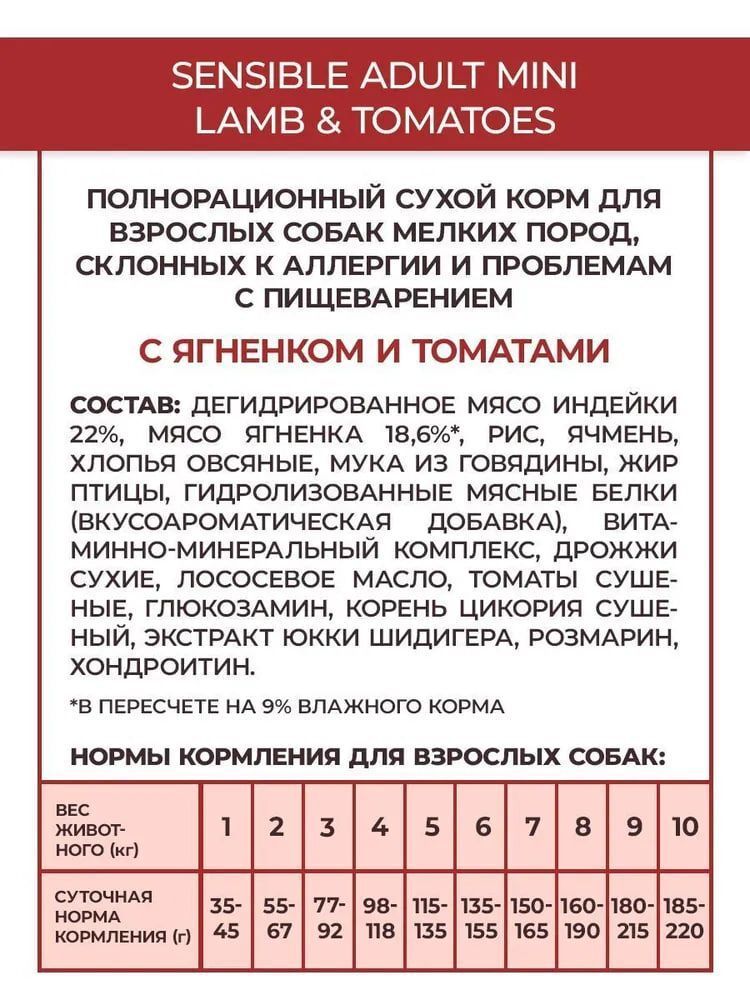 Полнорационный сухой корм для собак мелких пород склонных к аллергии и проблемам с пищеварением с ягненком и томатами