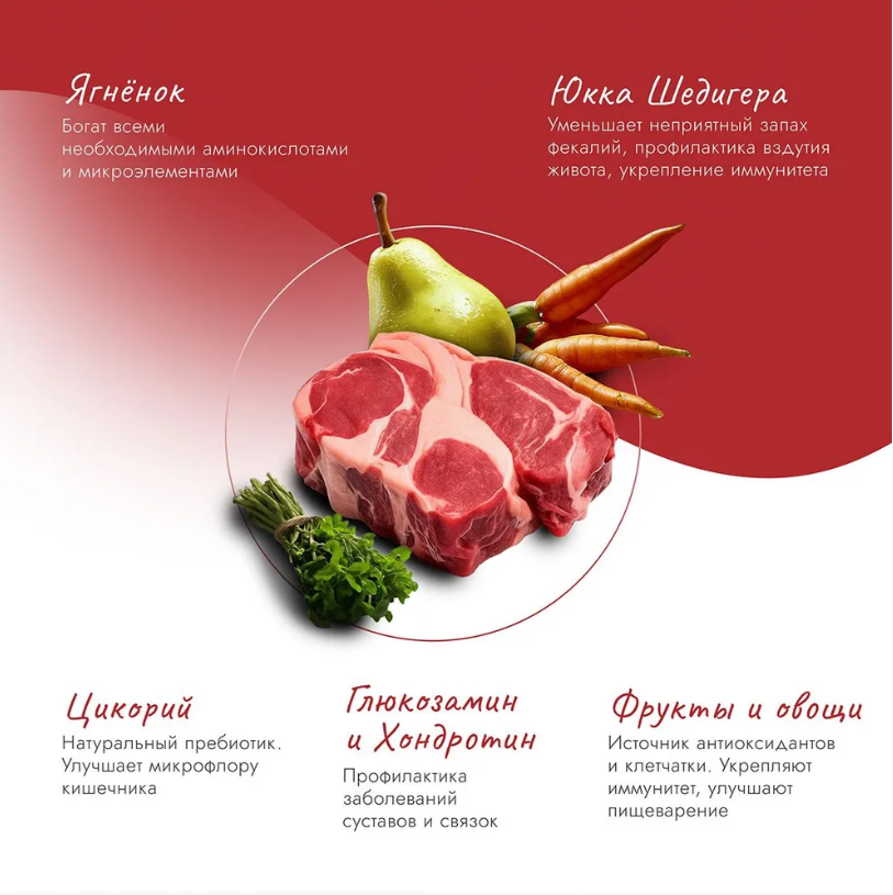 Дегидрированное мясо индейки (37%), свежее мясо телятины 10%, горох, картофель, рис, куриный жир, дегидратированные цельные яйца, рыбий жир, сушёные яблоки, морковь, орегано, морские водоросли, цикорий, DL-метиононин, таурин, глюкозамин, хондроитин, юкка Шидигера.