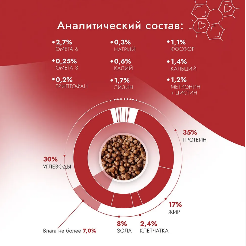 Сырой протеин 35,0%, сырой жир 17,0%, сырая клетчатка 2,4%, сырая зола 8,0 %, углеводы 30%, кальций 1,4%, фосфор 1,1%, натрий 0,3%, калий 0,6%, лизин 1,7%, метионин + цистин 1,2%, триптофан 0,2%, омега-3 жирные кислоты 0,25%, омега-6 жирные кислоты 2,7%, Влага не более 7,0%.