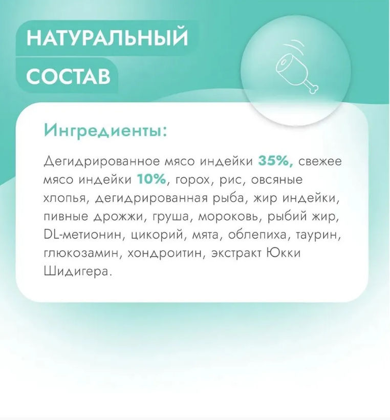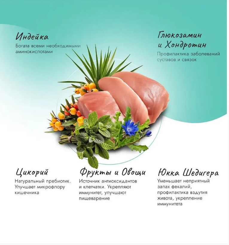Дегидрированное мясо индейки (35%), свежее мясо индейки 10%, горох, рис, овсяные хлопья, дегидрированная рыба, жир индейки, пивные дрожжи, груша, мороковь, рыбий жир, DL-метионин, цикорий, мята, облепиха, таурин, глюкозамин, хондроитин, экстракт Юкки Шидигера.