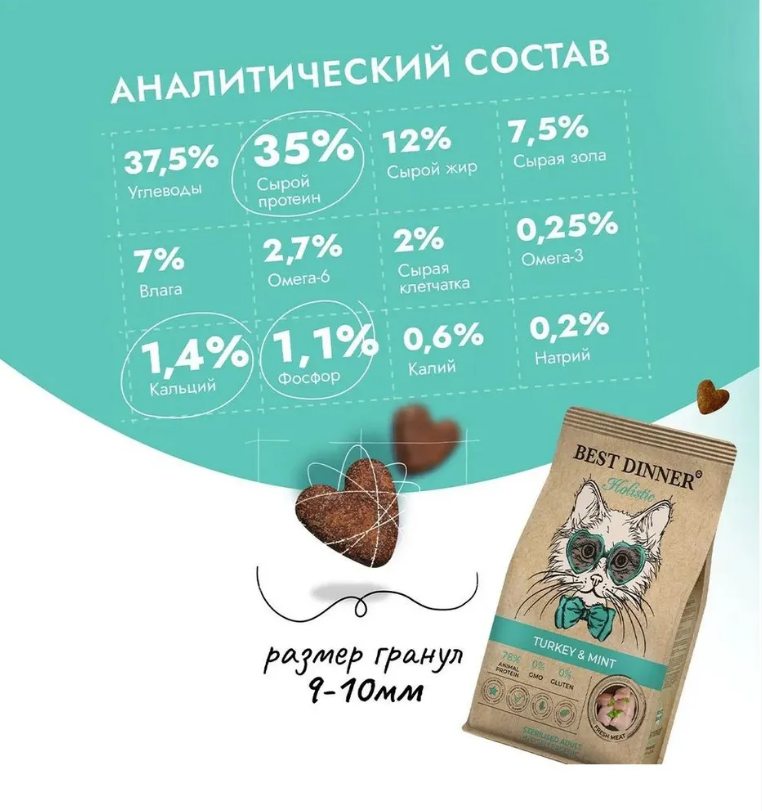Высококачественный низкозерновой рацион для кошек Best Dinner c Индейкой и мятой не оставит равнодушным ни одного пушистого гурмана. Свежее мясо индейки обладают высокой вкусовой привлекательностью и не нагружают работу желудочно кишечного тракта. Ароматная мята не только повышает вкусовую привлекательность корма, но и улучшают работу ЖКТ, а добавленные груша и корень цикория обеспечивают питание и развитие полезной кишечной микрофлоры. Добавленный DL -метионин профилактирует развитие мочекаменной болезни. Гранулы в форме сердечек не оставят равнодушными даже самых привередливых кошек.