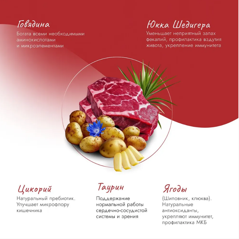 Дегидрирование мясо 38% (птицы 30%, говядины 8%), рис, ячмень, жир птицы, хлопья овсяные, картофель, гидролизованные мясные белки (вкусоароматическая добавка), витаминно-минеральный комплекс, дрожжи пивные сухие, масло лосося 0,8%, юкка Шидигера, плоды шиповника, клюква сушеная, глюкозамин, корень цикория сушеный, DL-метионин, таурин, хондроитин.