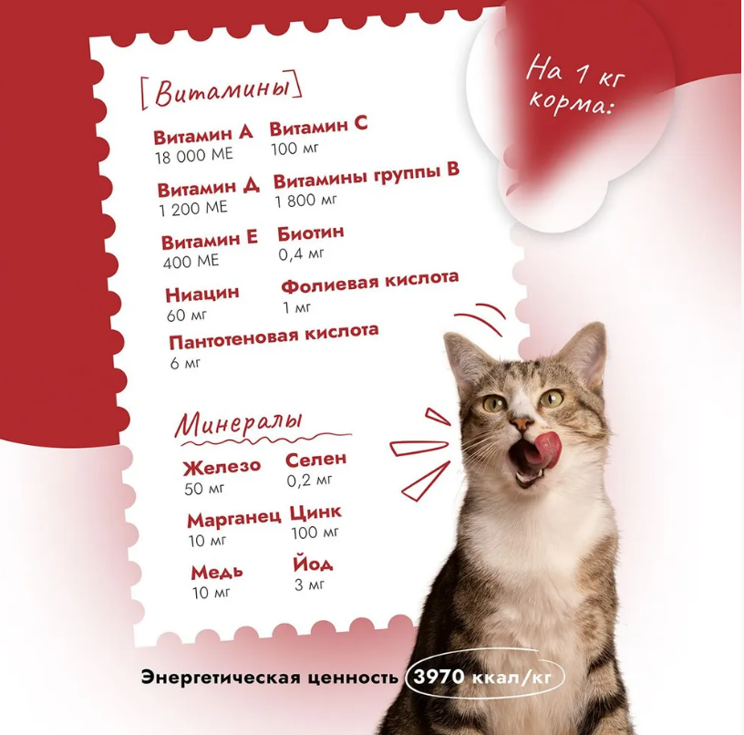 Сырой протеин 32,0%, сырой жир 18,0%, сырая клетчатка 2,5%, сырая зола 7,5%, углеводы 33,0%, кальций 1,3%, фосфор 0,9-1,1%, натрий 0,3%, калий 0,6%, лизин 3,0%, метионин + цистин 1,0%, триптофан 0,2%, омега-3 жирные кислоты 0,35%, омега-6 жирные кислоты 2,8 %, влага не более 8,0%.