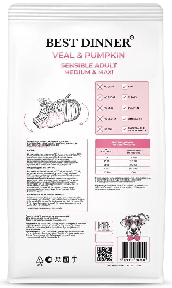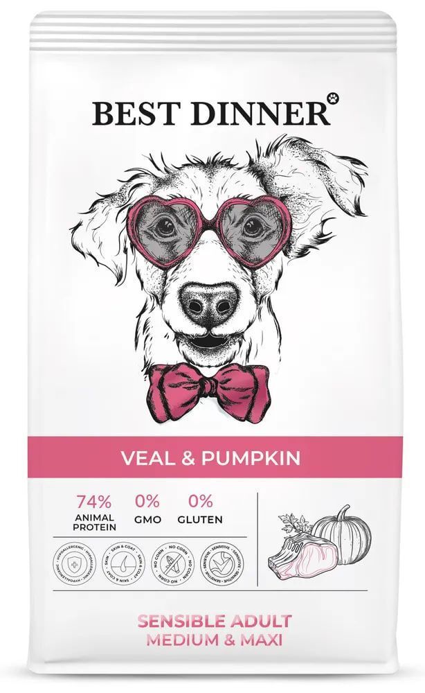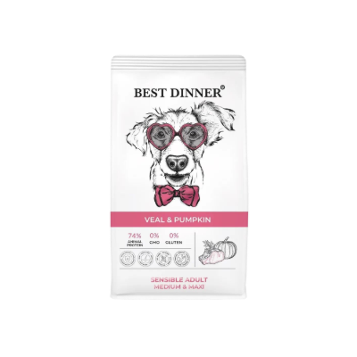 Высококачественный полнорационный корм для собак средних и крупных пород Best Dinner с телятиной и тыквой создан специально для собак с особыми потребностями.