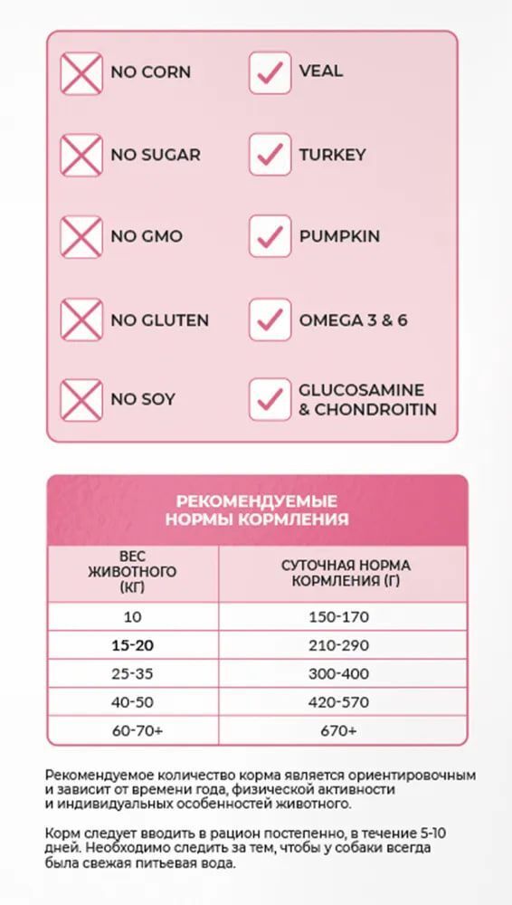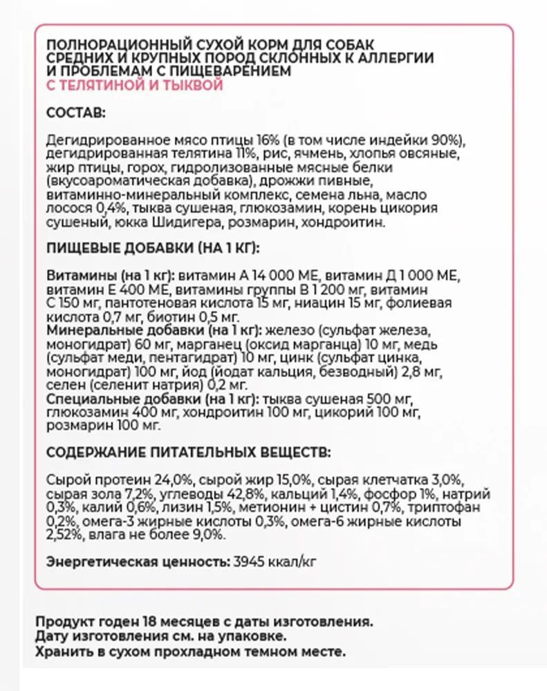 Ингредиенты: Дегидрированное мясо 27% (индейка 11%, телятина 11%, курица 5%), рис, ячмень, хлопья овсяные, жир птицы, горох, гидролизованные мясные белки (вкусоароматическая добавка), дрожжи пивные, витаминно-минеральный комплекс, семена льна, масло лосося 0,4%, тыква сушеная, глюкозамин, корень цикория сушеный, юкка Шидигера, розмарин, хондроитин.