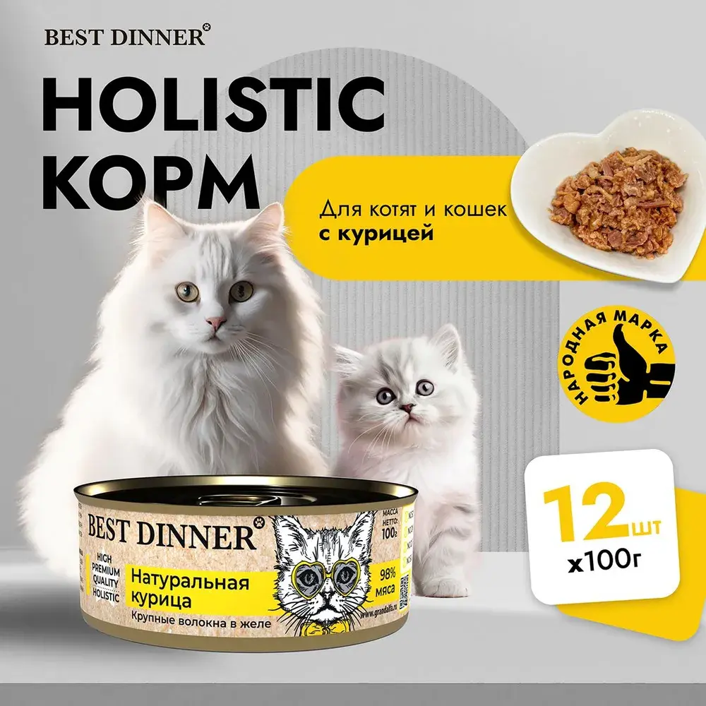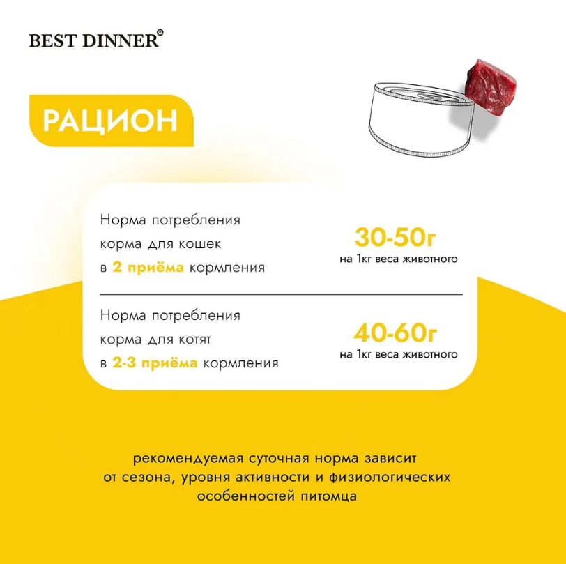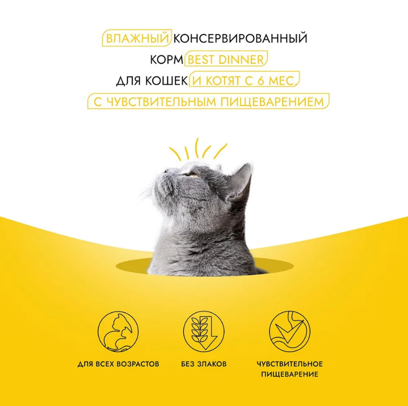 Мясные консервы для кошек Best Dinner – это продукты наивысшего качества, обладают изысканным вкусом, сбалансированным составом для правильного питания и здоровой жизни кошки. Изготовлены только из натуральных компонентов без искусственных красителей, консервантов и ароматизаторов.