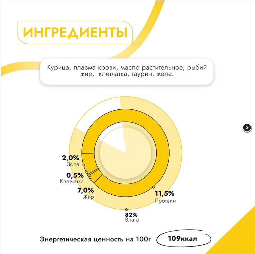 В 100 г содержится: сырой протеин, не менее 8,0 г, сырой жир, не более 16,0 г, сырая зола, не более 2,0 г, таурин 0,3 г, поваренная соль 0,4–0,6 г, влага, не более 82 %.