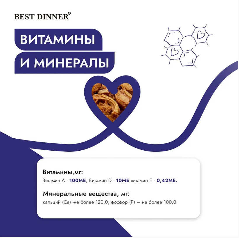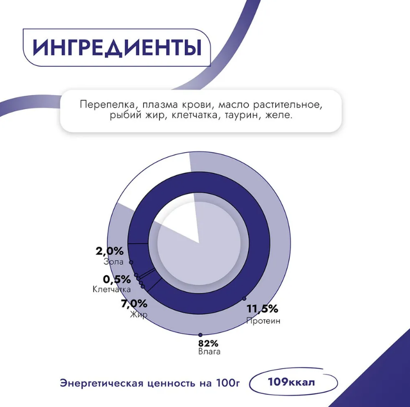 В 100 г содержится: сырой протеин, не менее 10,5 г, сырой жир, не более 12,0 г, сырая зола, не более 2,0 г, таурин 0,3 г, поваренная соль 0,4–0,6 г, влага, не более 82 %.