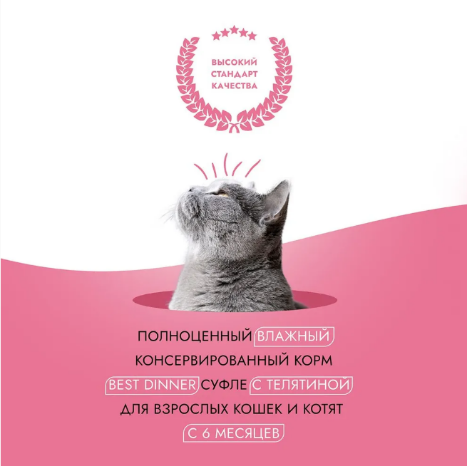 Откройте для своего питомца новый уровень заботы и удовольствия с премиальным влажным кормом для кошек и котят Best Dinner суфле! Этот элитный влажный корм для кошек создан специально для тех, кто ценит здоровье, вкус и качество. Идеально подходит для взрослых кошек и котят с 6 месяцев, этот корм станет незаменимым элементом ежедневного рациона вашего любимца.