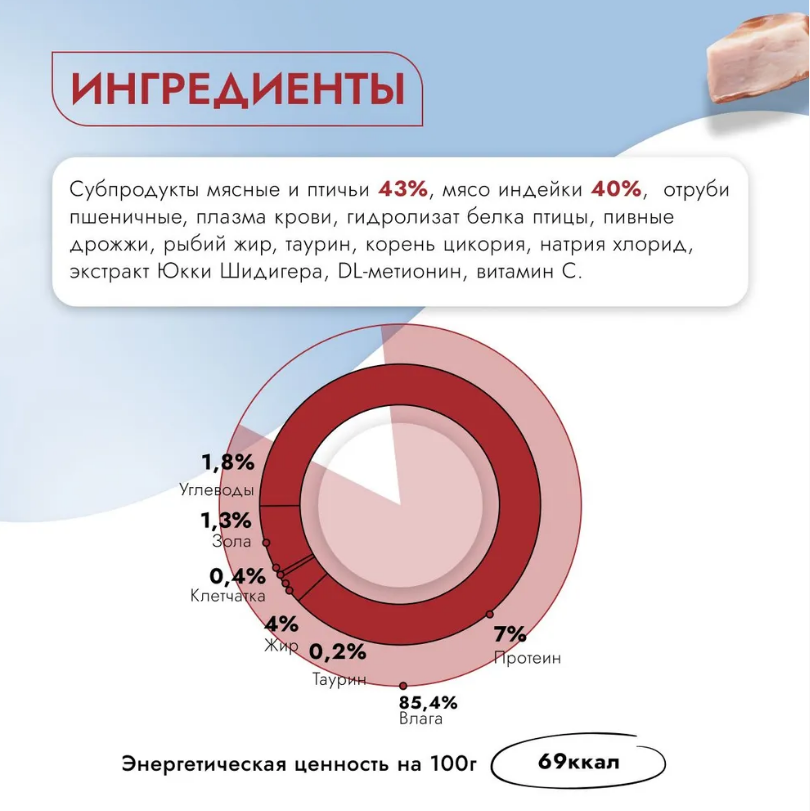 - **Натуральные ингредиенты:** Мясные и птичьи субпродукты, отруби пшеничные, плазма крови — источник натуральных нутриентов без искусственных добавок.