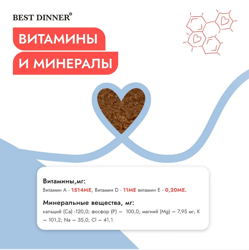 Консистенция паштета делает корм особенно аппетитным и легко усваиваемым. Влажный корм для кошек Best Dinner идеально подходит для ежедневного питания, обеспечивая ваше животное всеми необходимыми нутриентами.