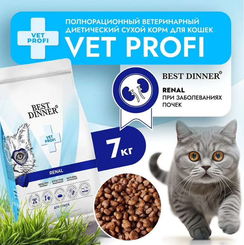 Если вы ищете качественный корм для кошек при почечной недостаточности, который поможет вашему питомцу чувствовать себя лучше и жить полноценной жизнью — выберите Best Dinner Vet Profi Renal. Выгодная упаковка 7 кг позволит экономить и заботиться о питомце одновременно. Заботьтесь о здоровье вашего кота уже сегодня — закажите сейчас и подарите ему долгие годы счастья и здоровья!