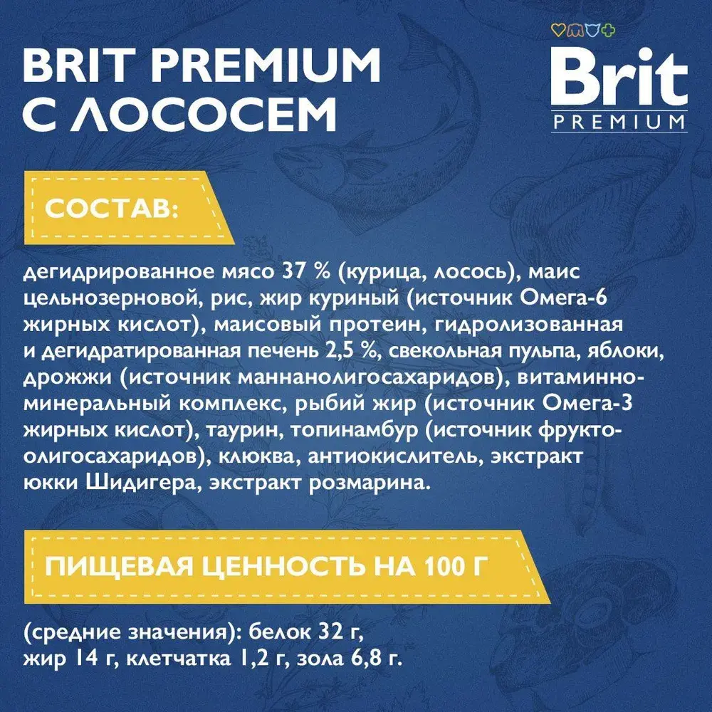 Сухой корм Brit Premium с лососем предназначен для взрослых кошек всех пород. Сбалансированный состав содержит все витамины и минералы, необходимые для ежедневного здорового питания вашего питомца. Корм поможет сохранить здоровье и активность вашего питомца, а лосось в составе обеспечивает притягательный аромат и вкус, который не оставит равнодушным даже самых привередливых питомцев.