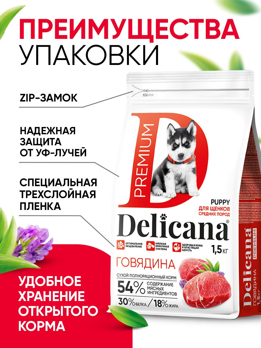 Delicana cухой полнорационный корм для щенков средних пород с говядиной.