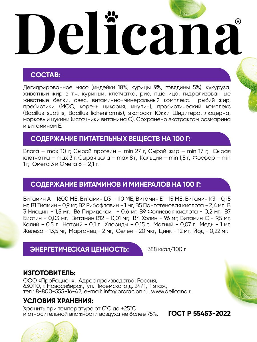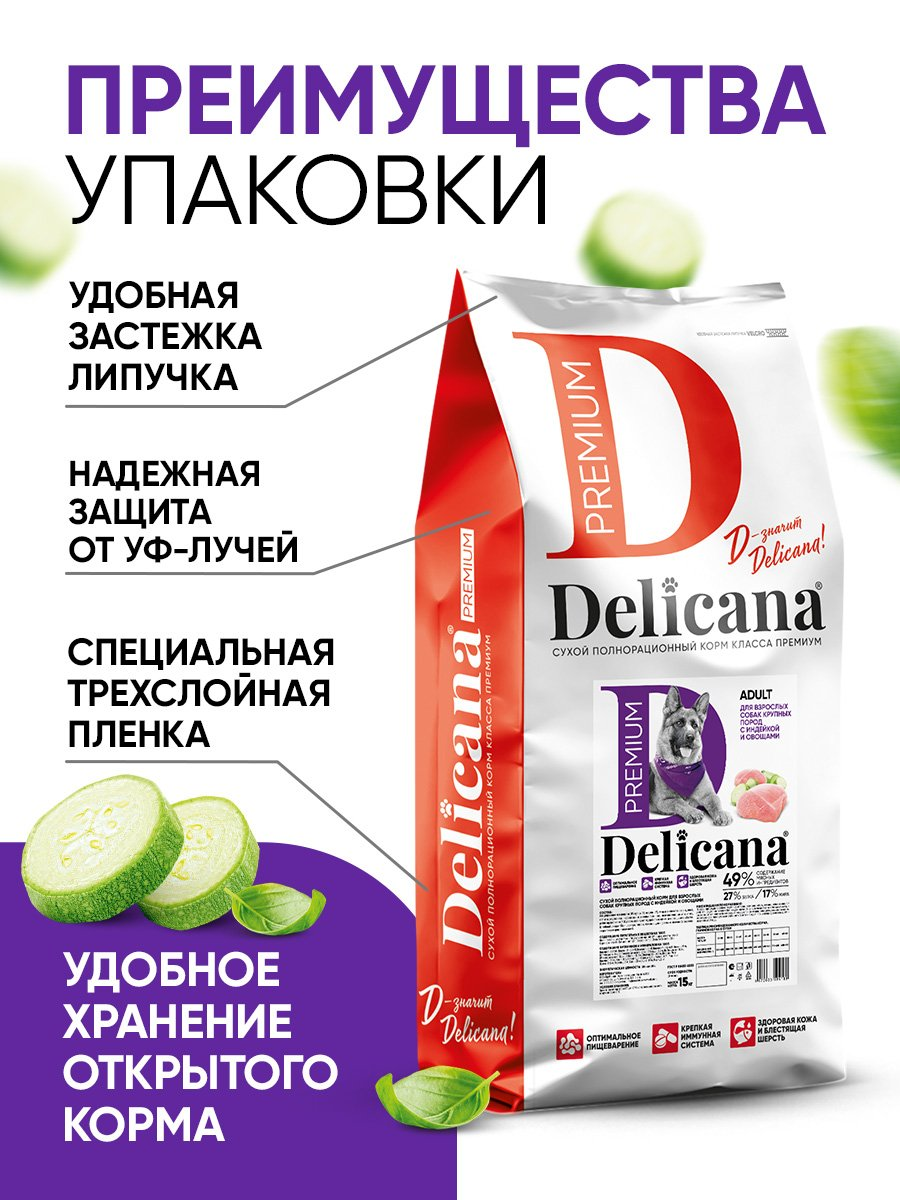 Delicana cухой полнорационный корм для взрослых собак крупных пород с индейкой и овощами.