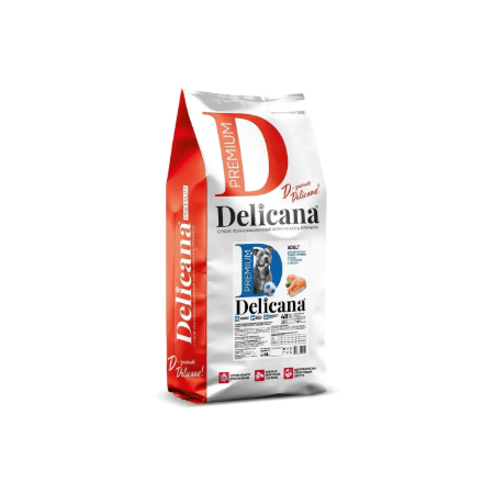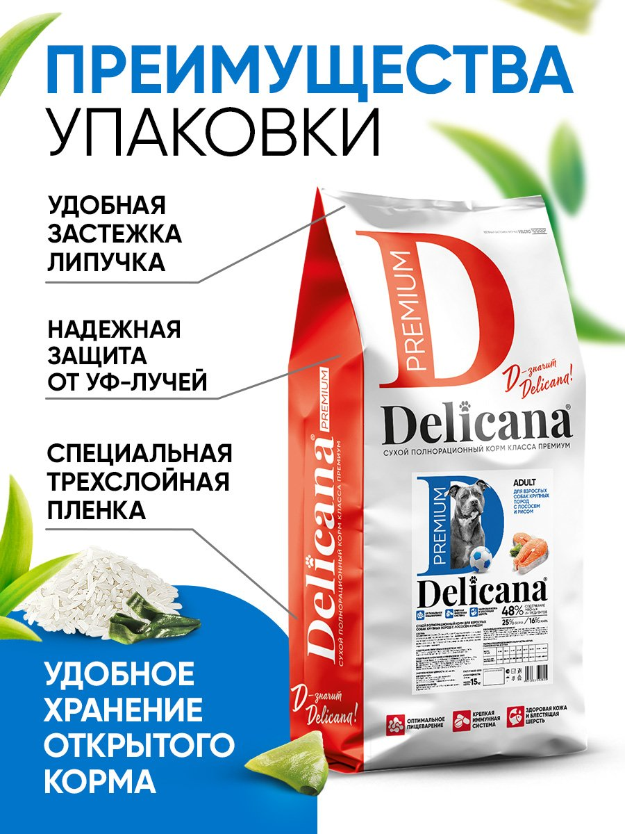 Delicana cухой полнорационный корм для взрослых собак крупных пород с лососем и рисом.